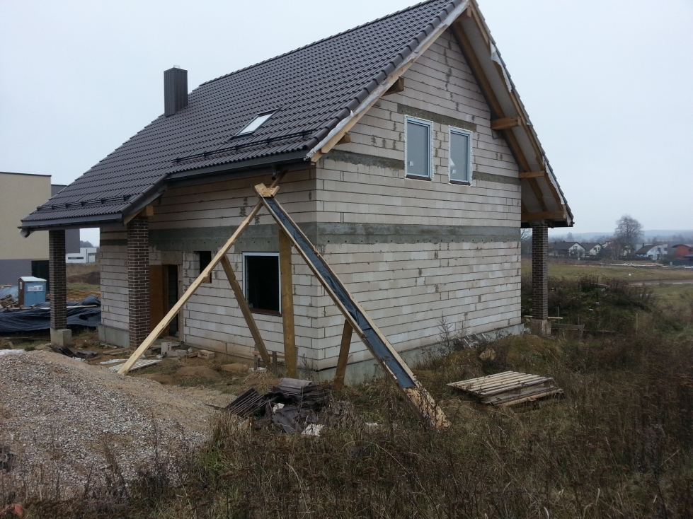 Beje, šias vidines pertvaras išjudinti būtų gan sudėtinga. Tai 15cm pločio sunkūs silikatiniai blokeliai, o ant šių pertvarų remiasi ir minėtieji mūrlotai. Visus šiuos darbus (išskyrus gegnių sukabinimą tarpusavyje) atlikau per vieną dieną, nelaukdamas stogdengių - pirmasis rimtas sniegas (kuris tikėtina, kad išskėstų stogą dar labiau) buvo pranašaujamas jau kitą dieną ;)